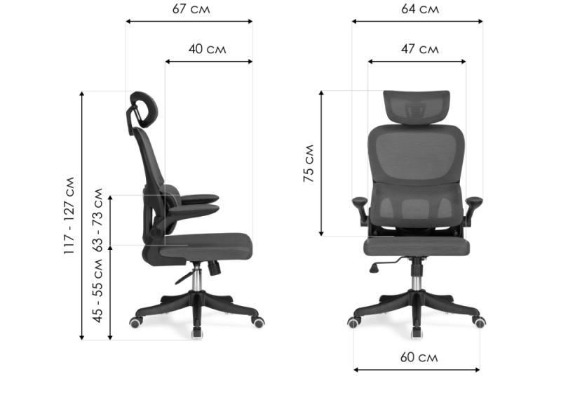 Высота подлокотников: 63 см. Диаметр крестовины: 60 см.